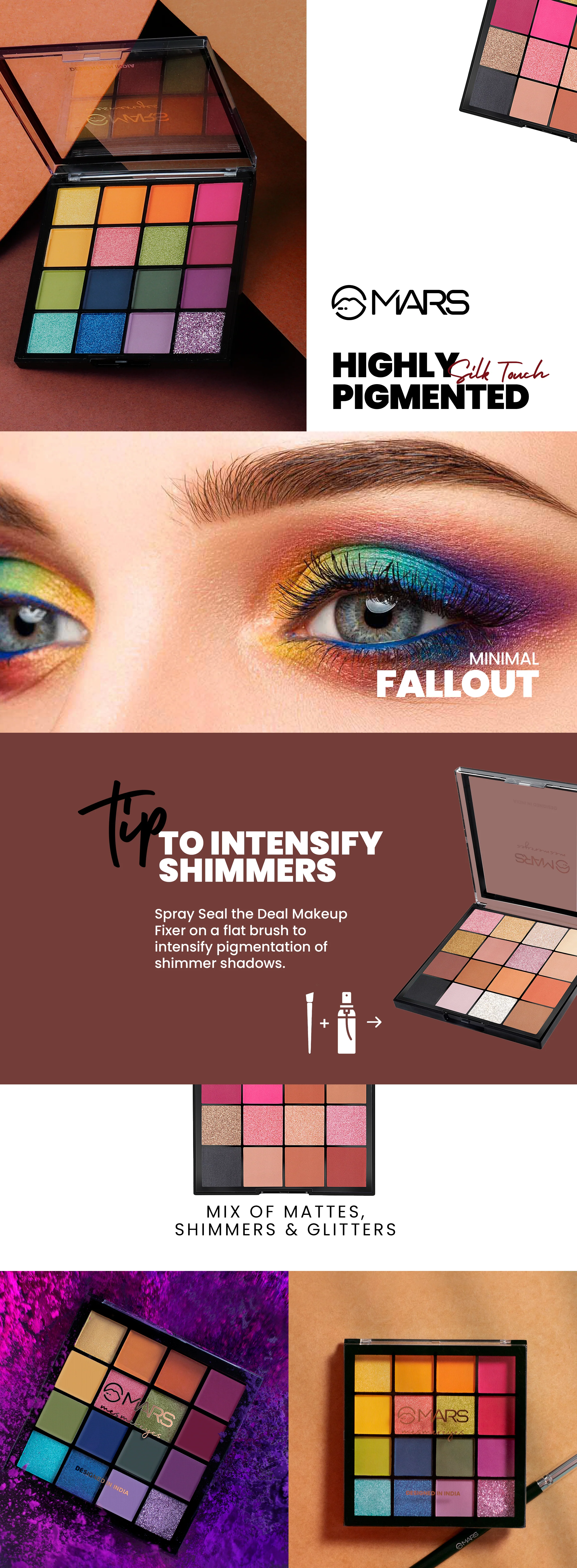 MARS Mesmereyes 16 Color Eyeshadow Palette are soft to touch, highly pigmented, non chalky and long lasting. The shades are created to allow you experiment with Soft Glam as well as bold looks. Pair it with creativity for best results.