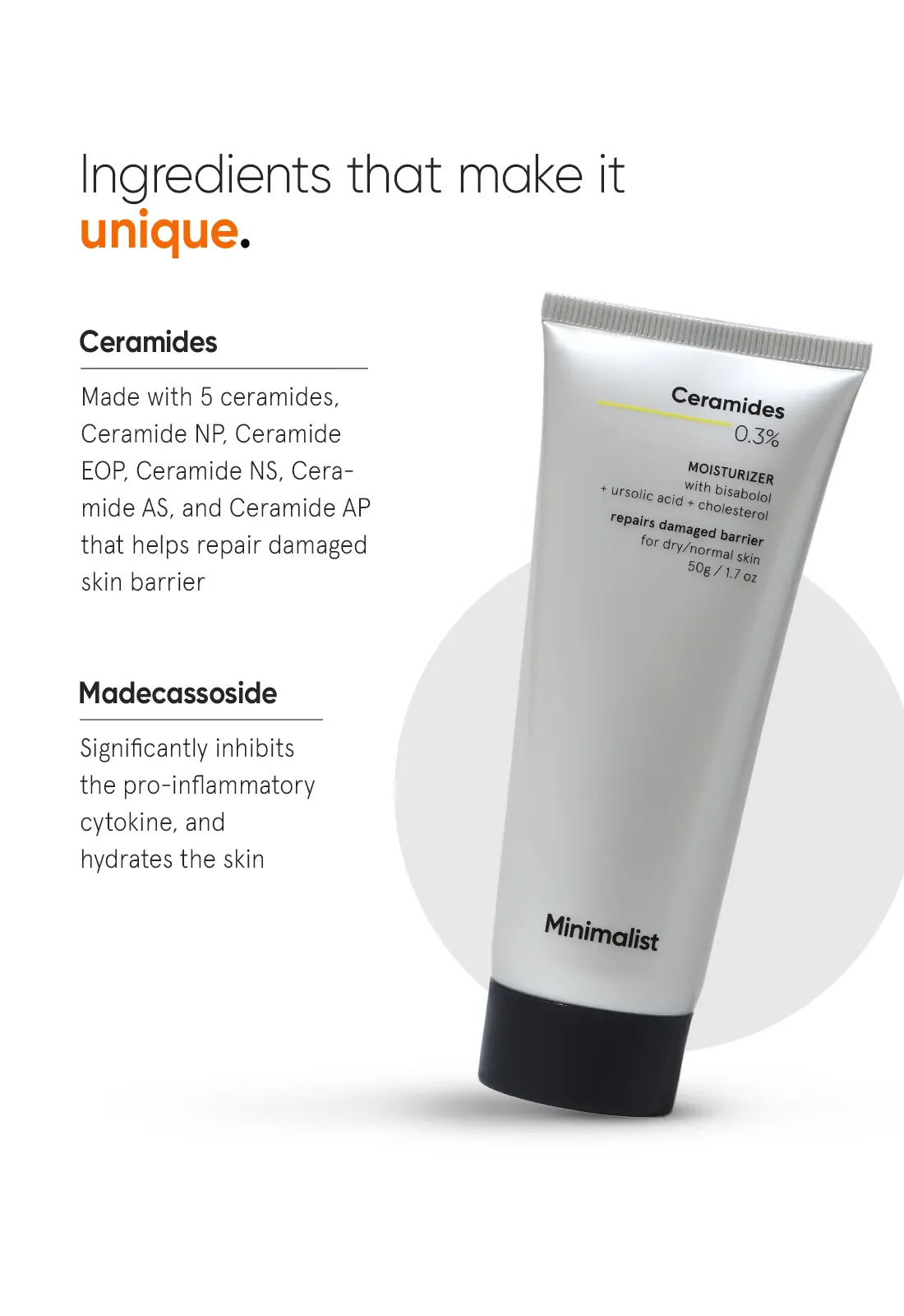 ত্বকের ন্যাচারাল ব্যারিয়ার মেরামত করতে এবং ইরিটেশন কমাতে Minimalist 0.3% Ceramides + Madecassoside Moisturizer (50g) একটি অত্যন্ত কার্যকর সলিউশন। এটি মূলত ড্যামেজড স্কিন রিপেয়ার করার জন্য ডিজাইন করা হয়েছে।