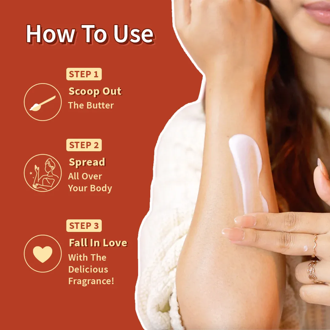 ব্যবহারের নিয়ম: গোসলের পর শরীর হালকা ভেজা থাকা অবস্থায় পুরো শরীরে পর্যাপ্ত পরিমাণে বডি বাটার ম্যাসাজ করুন। বিশেষ করে কনুই, হাঁটু এবং পায়ের গোড়ালিতে ভালো করে ব্যবহার করুন। রাতে ঘুমানোর আগেও এটি ব্যবহার করলে সকালে ত্বক অনেক বেশি নরম অনুভূত হবে।