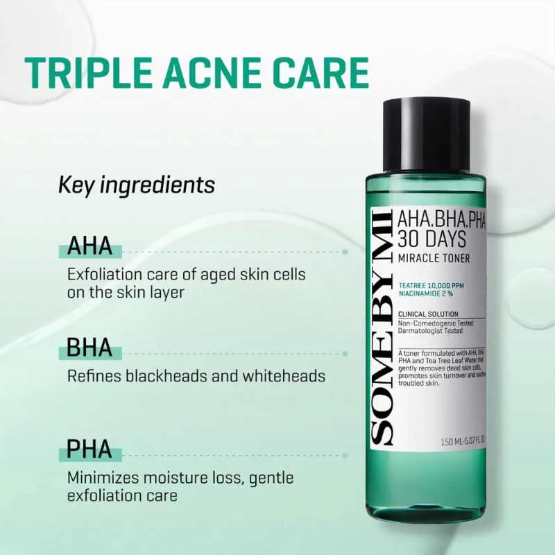 ত্বকের মরা কোষ দূর করে এবং ব্রণের সমস্যা কমিয়ে ত্বককে পরিষ্কার ও উজ্জ্বল করতে Some By Mi AHA BHA PHA 30 Days Miracle Toner (30ml) বিশ্বজুড়ে সমাদৃত। এর বিশেষ থ্রি-এসিড ফর্মুলা ত্বকের গভীরে গিয়ে কাজ করে।