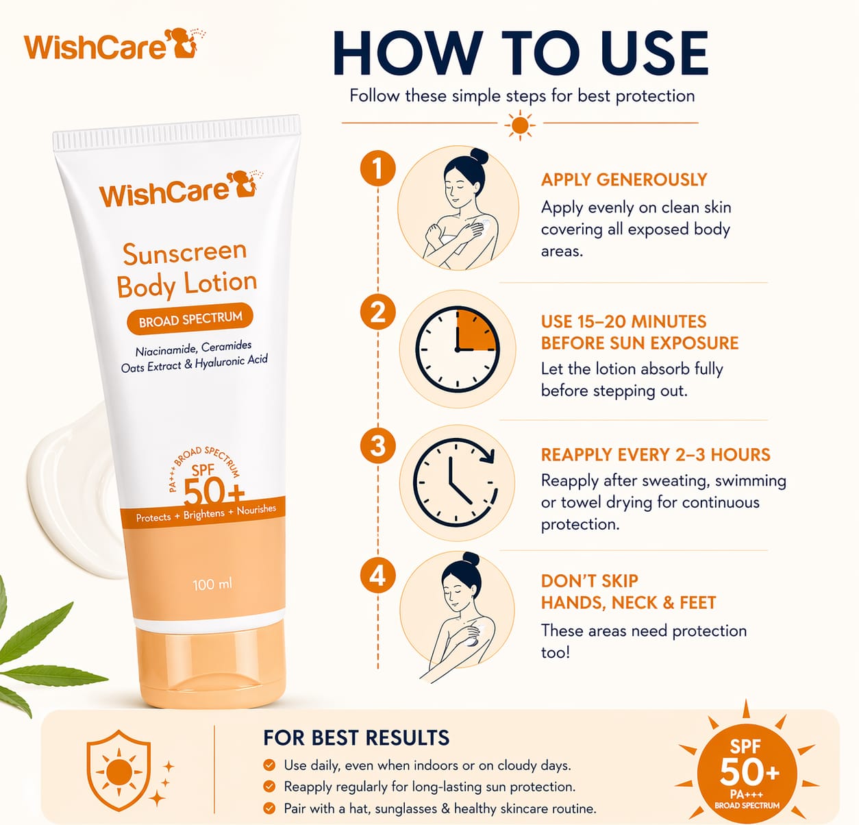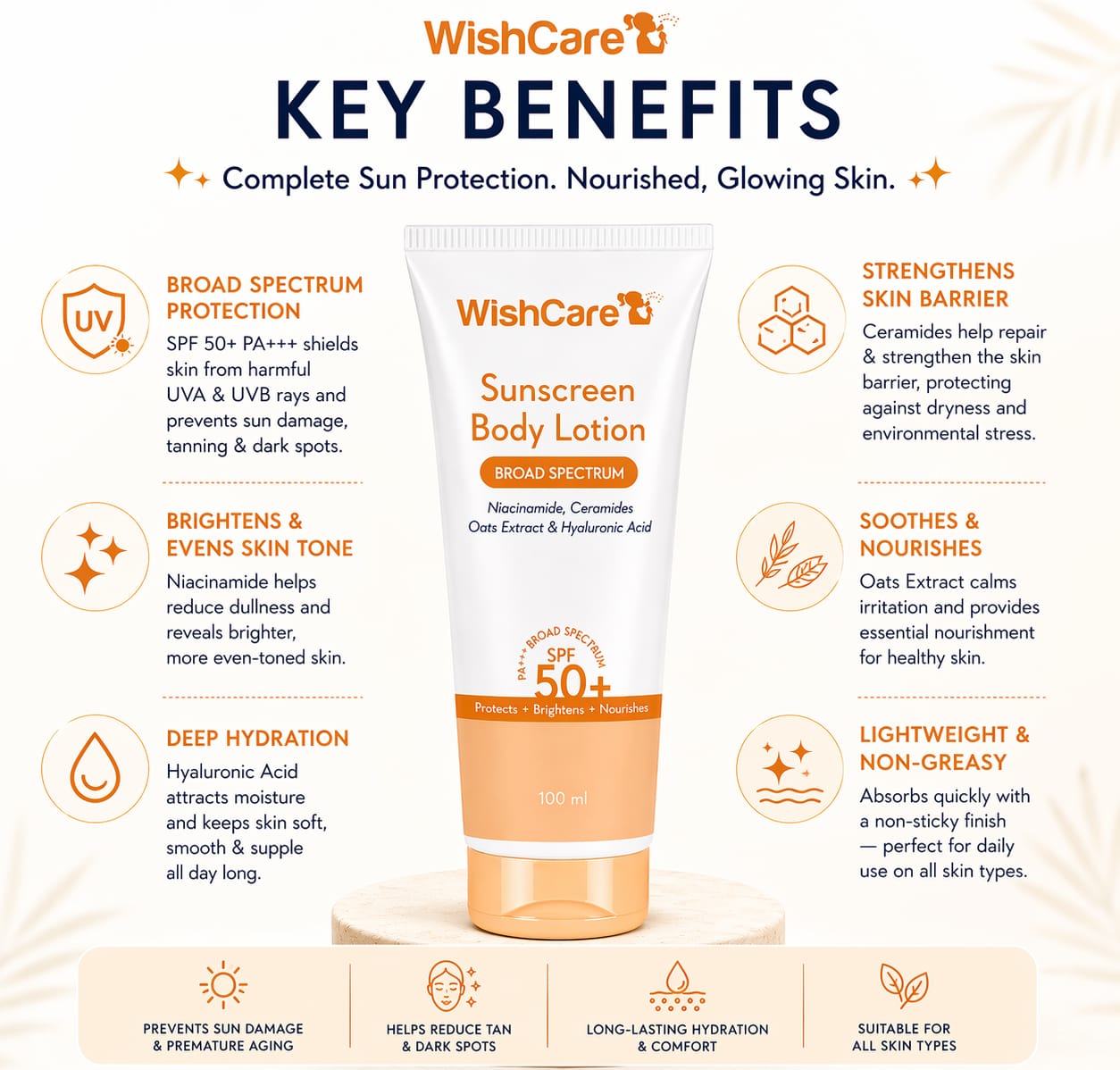 Protect and nourish your body with WishCare SPF 50 PA+++ Sunscreen Body Lotion. This advanced formula offers high-level broad-spectrum protection against harmful UVA and UVB rays, preventing sun damage and premature aging. Enriched with Niacinamide and natural extracts like Carrot Seed and Raspberry, it not only shields your skin but also works to brighten your complexion and maintain deep hydration throughout the day.