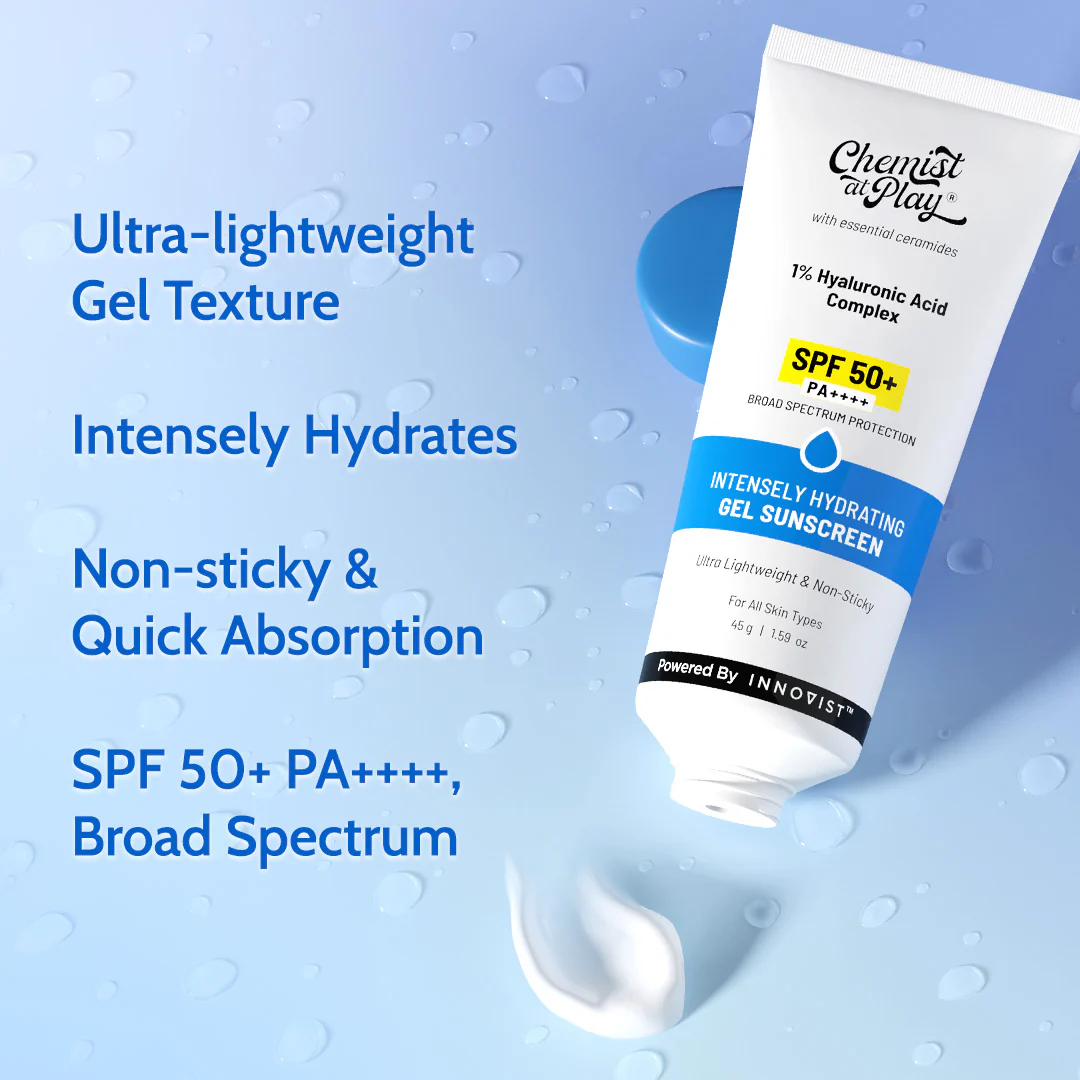Stay protected and hydrated with Chemist at Play 1% Hyaluronic Acid Complex Sunscreen. This ultra-lightweight gel formula offers SPF 50 PA++++ protection while drenching your skin in moisture. Infused with Ceramides, it strengthens the skin barrier and leaves a zero-white cast, dewy finish.