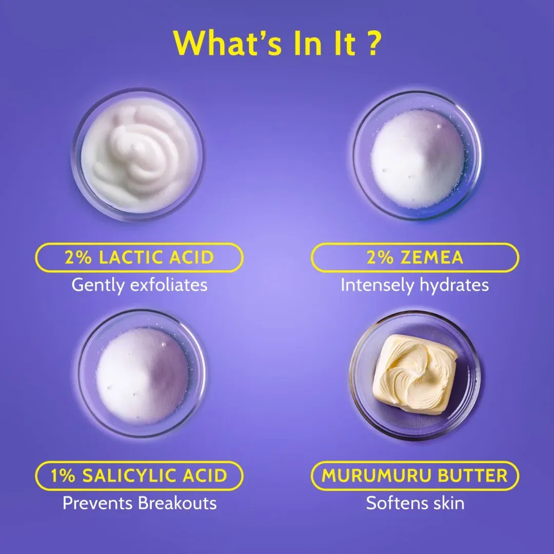 -GENTLE EXFOLIATION: এতে থাকা ল্যাকটিক অ্যাসিড (AHA) ত্বকের উপরের মৃত কোষ এবং ময়লা আলতোভাবে পরিষ্কার করে। ফলে কোনো প্রকার ঘষাঘষি ছাড়াই ত্বক হয়ে ওঠে উজ্জ্বল ও মসৃণ।