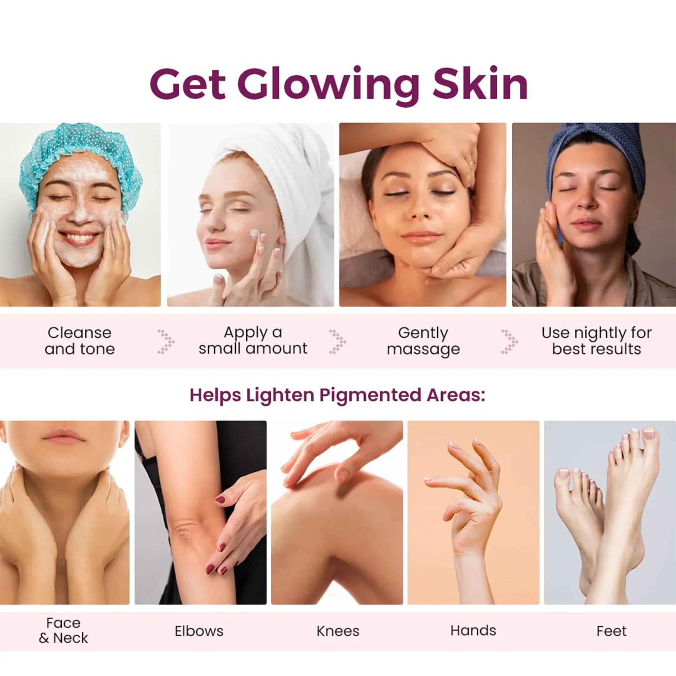 -Triple Action Brightening: এতে থাকা Glutathione এবং Kojic Acid সরাসরি ত্বকের গভীর স্তরে কাজ করে কালচে ভাব দূর করে এবং ত্বককে আগের চেয়ে অনেক বেশি ফর্সা ও উজ্জ্বল দেখায়।