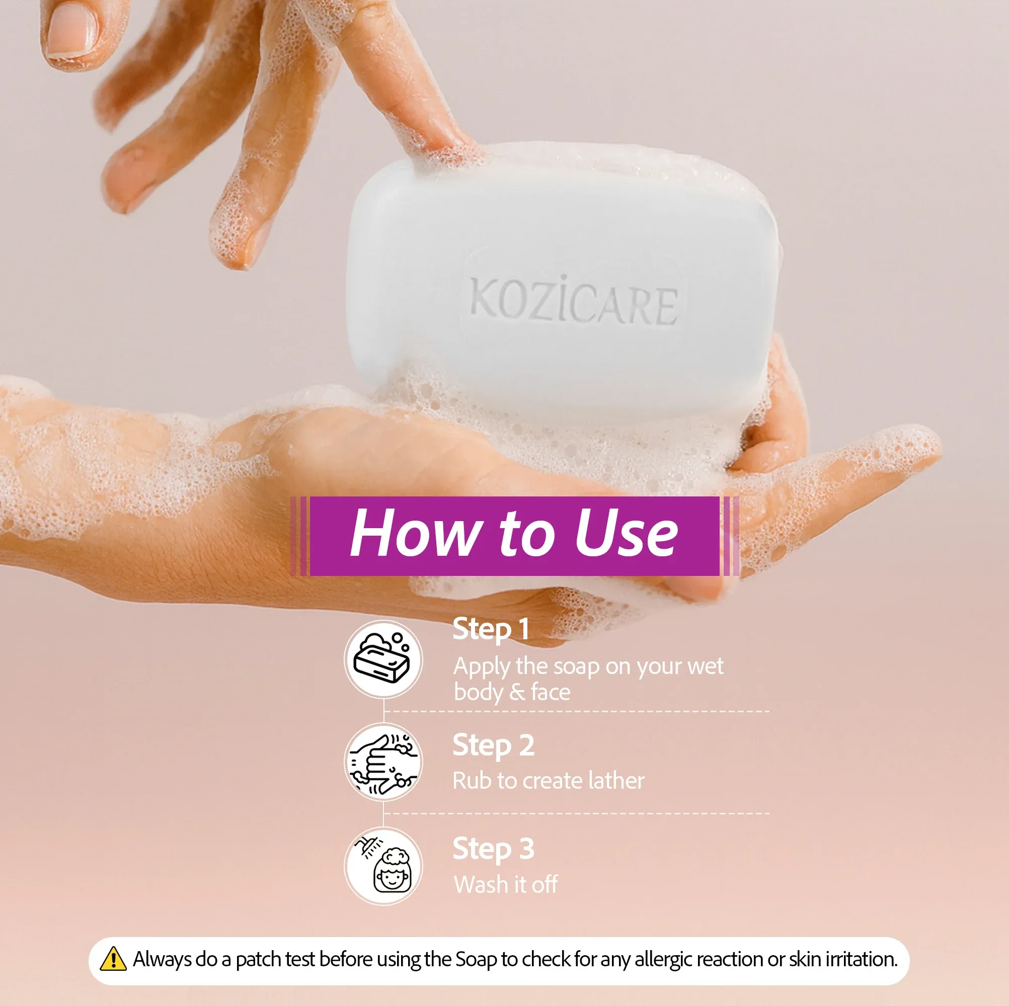 পুরো শরীরের ত্বক উজ্জ্বল এবং দাগহীন করতে Kozicare Skin Lightening Soap একটি অত্যন্ত জনপ্রিয় এবং কার্যকর সলিউশন। এটি শুধু একটি সাবান নয়, বরং এটি একটি স্কিন ট্রিটমেন্ট যা গোসলের সময় আপনার ত্বকের মেলানিন উৎপাদন নিয়ন্ত্রণ করতে এবং মরা কোষ দূর করতে সাহায্য করে।