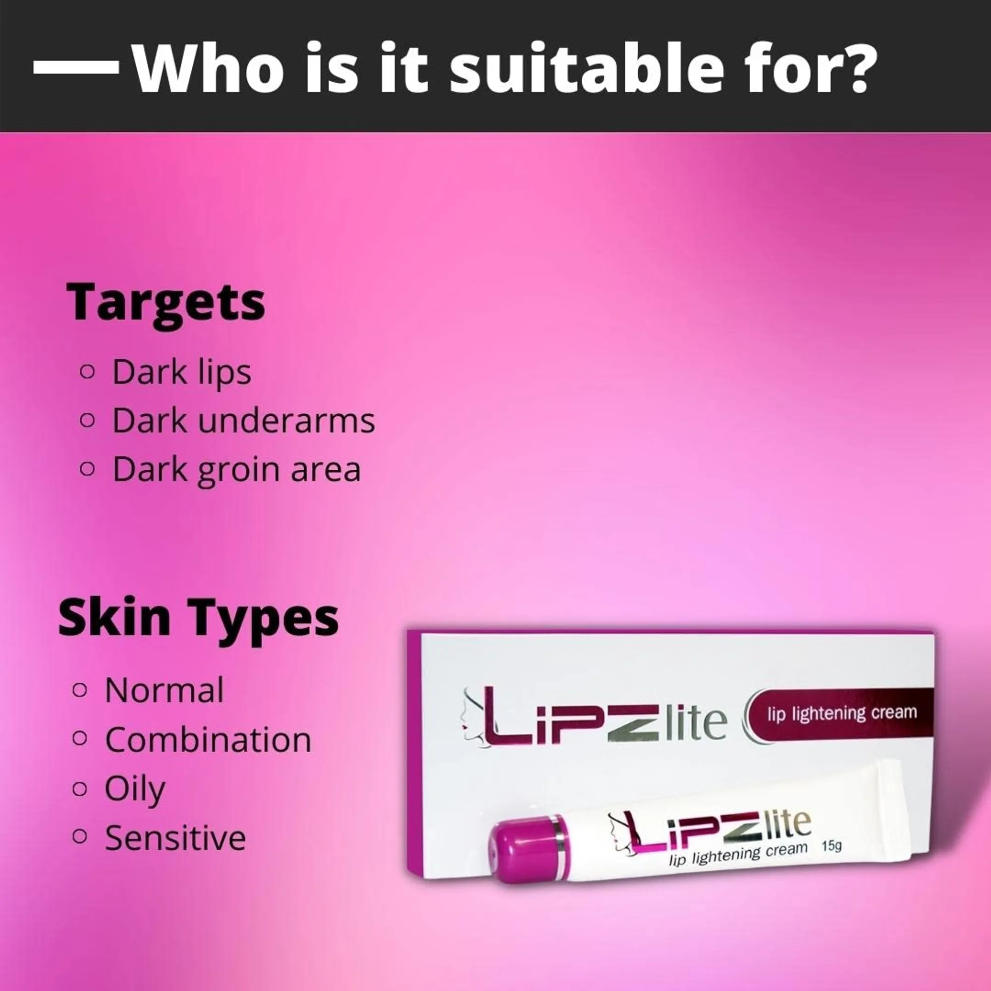 ঠোঁটের কালচে ভাব দূর করে স্বাভাবিক উজ্জ্বলতা ফিরিয়ে আনতে Lipzlite Lip Lightening Cream একটি অত্যন্ত জনপ্রিয় ডার্মাটোলজিক্যাল সলিউশন। ধূমপান, অতিরিক্ত কফি পান, নিম্নমানের লিপস্টিক ব্যবহার বা সূর্যের আলোতে ঠোঁট কালো হয়ে গেলে এই ক্রিমটি জাদুর মতো কাজ করে।
