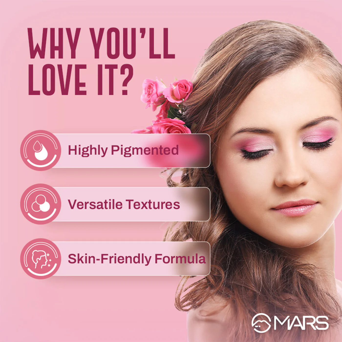MARS Blooming Eyeshadow Palette features 6 richly pigmented, buttery-soft shades that blend with ease. Choose from 4 curated palettes designed to suit every skin tone, perfect for soft daytime looks or bold, dramatic styles.