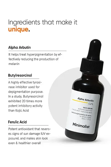 ত্বকের জেদি পিগমেন্টেশন এবং রোদে পোড়া কালচে ভাব (Sun Tan) দূর করতে Minimalist Alpha Arbutin 2% Face Serum (30ml) একটি বিশ্বস্ত নাম।