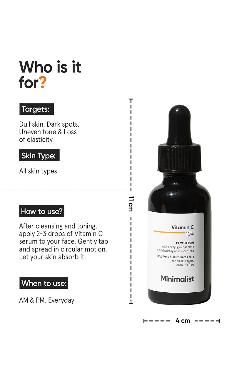 Illuminate your skin with the Minimalist Vitamin C 10% Face Serum. Formulated with a stable Vitamin C derivative (Ethyl Ascorbic Acid), this serum provides a powerful antioxidant boost to brighten dull skin, reduce sun damage, and even out skin tone. Infused with Acetyl Glucosamine, it delivers a healthy, lit-from-within glow without the irritation.