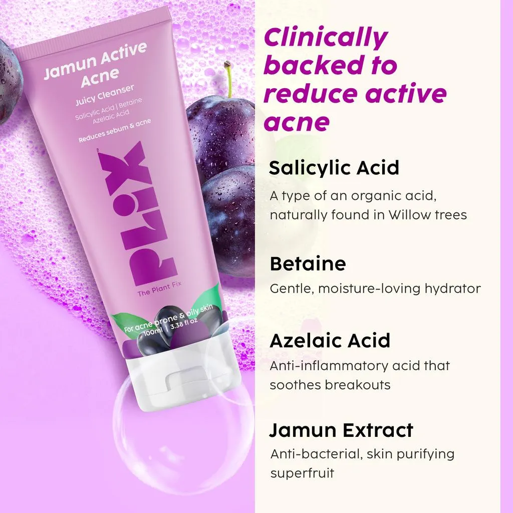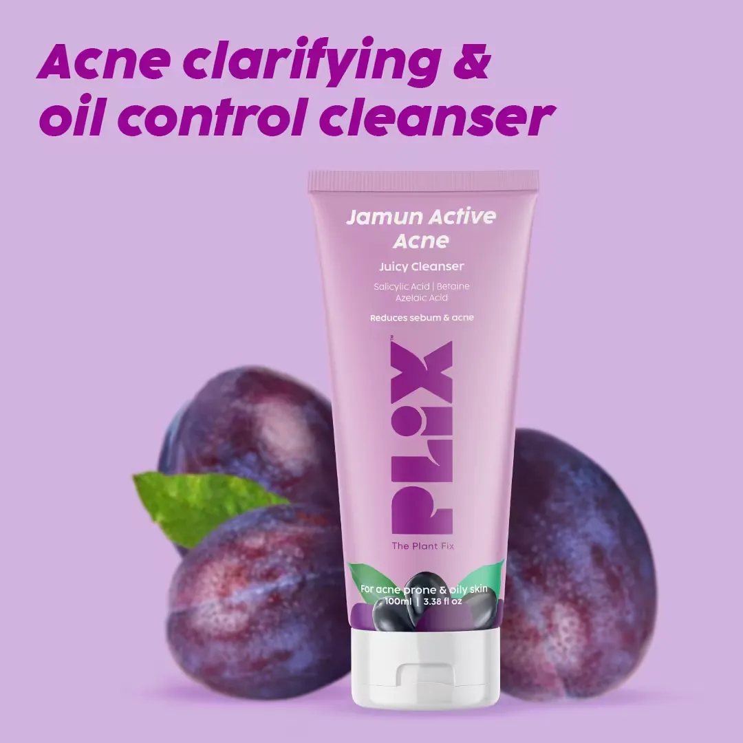 Fight active acne and control excess oil with Plix Jamun Active Acne Juicy Cleanser. This powerful, soap-free formula is packed with clinically backed actives like Salicylic Acid, Azelaic Acid, and Betaine. It deeply cleanses pores, reduces sebum production, and calms inflammation for a clearer, acne-free complexion.