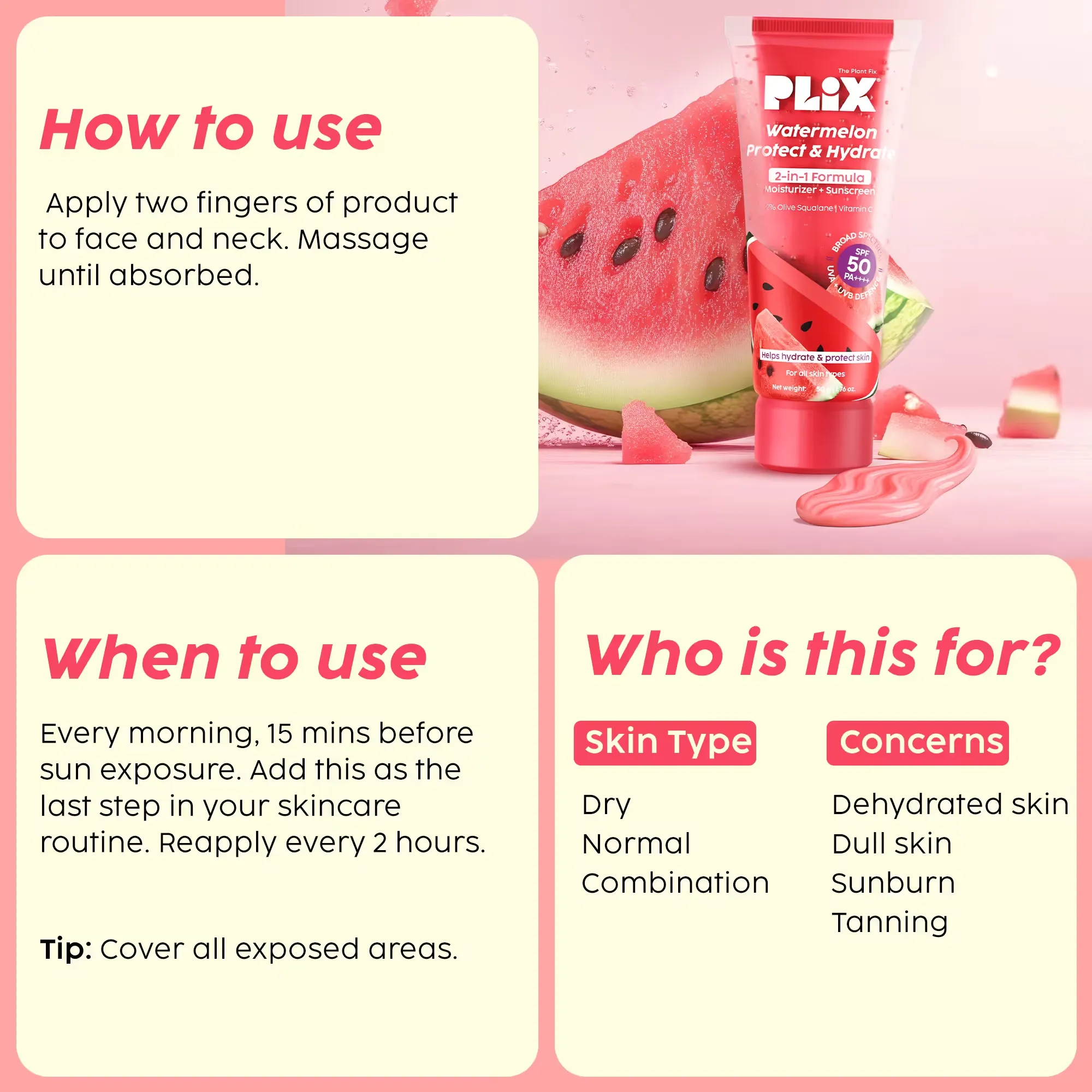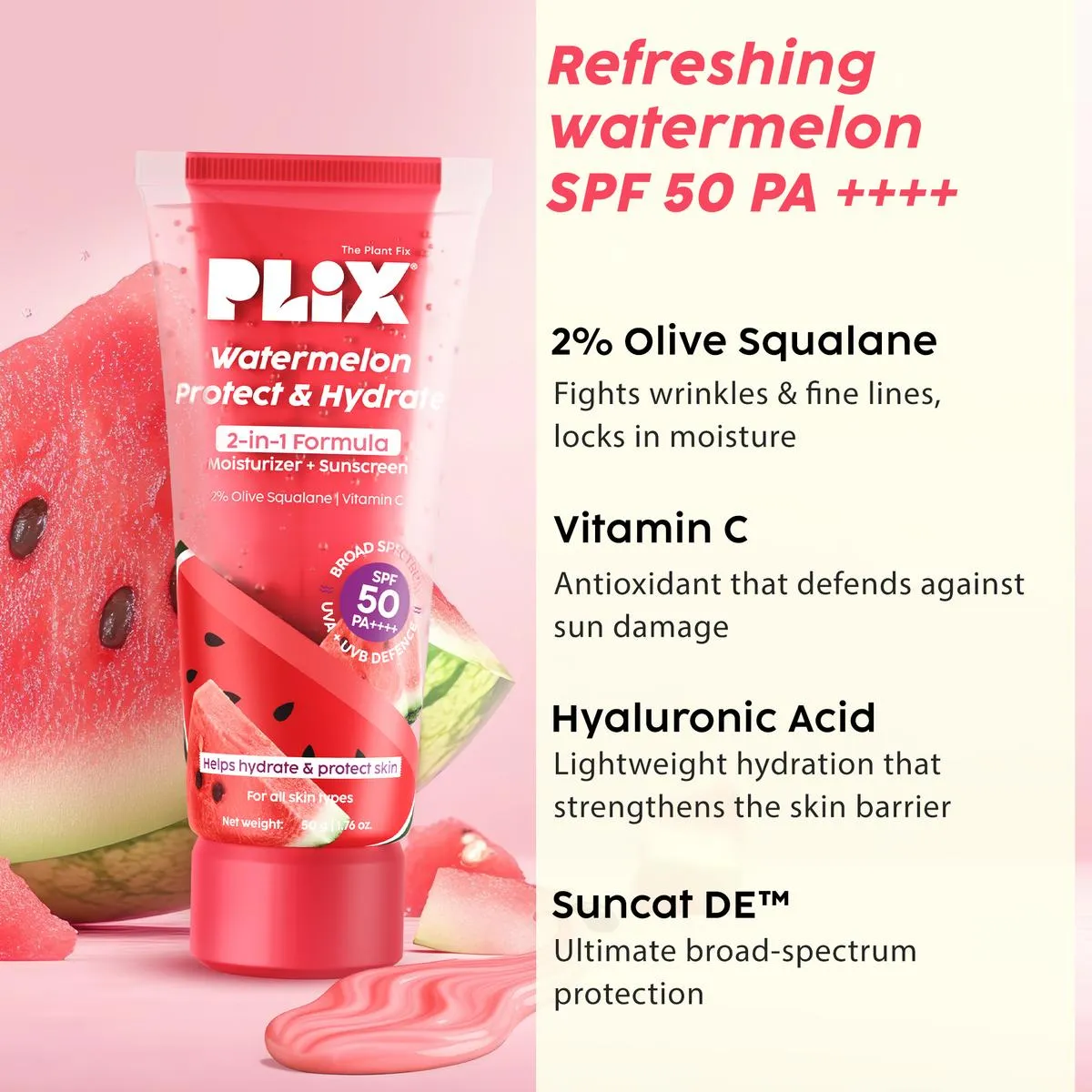 Streamline your skincare routine with Plix Watermelon Protect & Hydrate 2-in-1 Formula. This multi-tasking essential combines the deep hydration of a Moisturizer with the broad-spectrum protection of a Sunscreen. Infused with 2% Olive Squalane, Vitamin C, and Watermelon Extract, it leaves your skin soft, bright, and shielded from the sun.