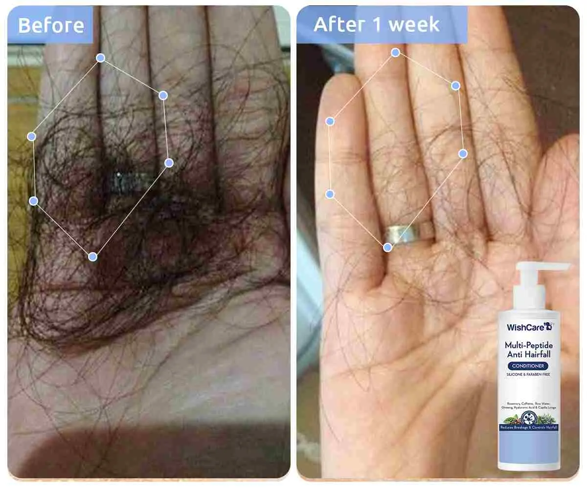 চুল ধোয়ার সময় কি গোছা গোছা চুল ছিঁড়ে যাচ্ছে? শ্যাম্পু করার পর চুল কি প্রাণহীন আর জট পাকানো হয়ে থাকে? WishCare Multi-Peptide Anti Hairfall Conditioner আপনার চুলের সেই হারিয়ে যাওয়া শক্তি এবং উজ্জ্বলতা ফিরিয়ে আনতে তৈরি।